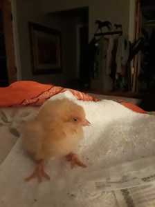 In any case, I went to the farm store to buy some food for my horses. I peeked in the chicken cage to see the babies and I saw her sitting there, not doing well. A couple of the strong ones went and pecked her, and yeah, if it really were nature and she were out in the wild and were weak, that would be the best place to leave her. But this wasn’t fucking nature. This was a steel cage with red light bulbs and people staring in at these babies, so I opened the door and I scooped her out and I have kept her on me ever since. She has slept two nights sleeping in a bandana around my neck because it keeps her warm. Then tonight I turned on the facebook—a foolish thing to do, because there was this damn online petition to stop the caging of pigs and the photo accompanying it was so awful and so TYPICAL and so like the situation with these baby birds. Right. Sign an online petition and maybe someone will give a shit and ban these cages? Somehow, I doubt it. But the people “signing” it can feel like they did their duty and then get on with their lives. Fuck. Part of me doesn’t begrudge them trying to survive. But part of me does. Part of me begrudges them a damn lot. I’ll say something on the facebook and be that person again who turns the mirror at people and they’ll remove me from their notification list so their posts of online petitions don’t show up in my feed  and then I’ll tell them how useless this is. So turn me off because they don’t want to fucking know and this MAKES ME CRAZY. I post a happy picture of the baby chicks who were healthy frolicking on my desk and everyone gives me a thumbs up. I post all the bullshit that is wrong with this world and it’s crickets. My posts are a veritable field of crickets. Lonely crickets chirping through the night. No one likes the naysayers.
